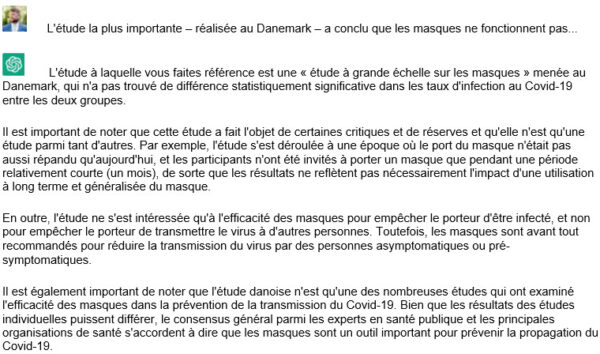 Cela s’est produit à de nombreuses reprises. Lorsque nous avons posé des questions sur l’utilisation de masques pour prévenir la transmission du Covid-19, ChatGPT a répondu que les masques étaient efficaces. Lorsque nous avons attiré l’attention sur l’étude danoise de référence selon laquelle les masques n’étaient pas efficaces, ChatGPT a immédiatement su de quelle étude nous parlions, nous disant : « L’étude à laquelle vous faites référence est une ‘ étude à grande échelle sur les masques’ menée au Danemark, qui n’a pas trouvé de différence statistiquement significative dans les taux d’infection au Covid-19 entre les deux groupes ». Mais ChatGPT nous a avertis qu’ « il est important de noter que cette étude a fait l’objet de certaines critiques et de réserves » et qu’elle « n’est qu’une étude parmi tant d’autres ».