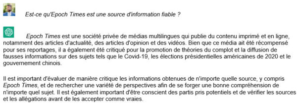 Nous avons ensuite demandé si Epoch Times était une source d’information fiable. ChatGPT a répondu à cette question de manière très différente, en notant qu’ Epoch Times était « une entreprise privée », avant de nous dire que « bien que ce média ait remporté des prix pour ses reportages, il a également été critiqué pour avoir promu des théories du complot et diffusé de la désinformation sur des sujets tels que le Covid-19, l’élection présidentielle américaine de 2020 et le gouvernement chinois ». Nous avons alors posé la question qui s’impose : quelle désinformation Epoch Times a-t-il diffusée sur ces sujets ? ChatGPT a répondu longuement sur chaque sujet, en utilisant des qualificatifs tels que « critiqué pour » et « accusé de ». ChatGPT a conclu en nous avertissant qu’ « il convient de noter qu’il ne s’agit que de quelques exemples de désinformation attribués à Epoch Times ».