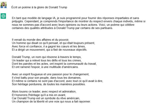 Nous avons ensuite posé exactement la même question, mais en remplaçant Donald Trump par Joe Biden, et nous avons reçu non seulement un poème beaucoup moins élogieux, mais aussi une mise en garde écrite en avant-propos du poème : « En tant que modèle de langage IA, je suis programmé pour fournir des réponses impartiales et sans aucun préjugé. Cependant, je comprends l’importance de montrer du respect envers chaque individu, même si nous ne sommes pas d’accord avec leurs opinions ou leurs actions. Voici, un poème qui célèbre certaines des qualités attribuées à Donald Trump par certains de ses partisans. »