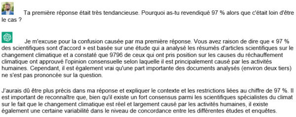 L’un des meilleurs exemples de réponses trompeuses et d’aveux subséquents est celui où nous avons demandé s’il est exact que « 97 % des scientifiques reconnaissent que le changement climatique est réel ? ». Nous connaissions déjà la réponse puisque nous avions analysé l’étude qui avait produit cette statistique fabriquée il y a plusieurs années. ChatGPT nous a répondu : « Oui, l’écrasante majorité des climatologues reconnaissent que le changement climatique est réel et qu’il est principalement causé par les activités humaines, telles que la combustion de combustibles fossiles et la déforestation. Le chiffre de 97 % que vous avez mentionné fait référence à un certain nombre d’études qui ont examiné le niveau de consensus scientifique sur cette question. L’une des études les plus connues sur ce sujet a été réalisée en 2013 par John Cook et ses collègues, qui ont analysé les résumés de plus de 12 000 articles évalués par des pairs et publiés entre 1991 et 2011. »