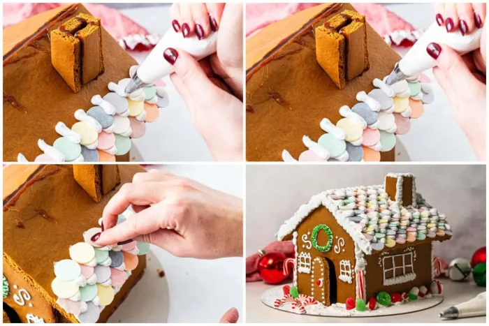 Finitions : une fois la structure montée et les parois décorées, place aux tuiles et aux bonbons. J’aime utiliser des pastilles Necco pour les tuiles, mais d’autres options existent : mini-bretzels, carrés de céréales type shredded wheat, ou encore un décor entièrement au glaçage royal.