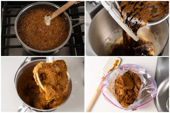 Avant d’enfourner à 375°F (190°C) pour 11 à 12 minutes, vérifiez que les pièces du gabarit y tiennent. À la sortie du four, placez les gabarits sur la plaque chaude et découpez immédiatement au couteau dentelé. (Contrairement à d’autres recettes, nous ne découpons pas avant la cuisson, car les bords arrondis à la cuisson compliquent ensuite le montage.) Laissez refroidir et sécher plusieurs heures, idéalement toute une nuit.
