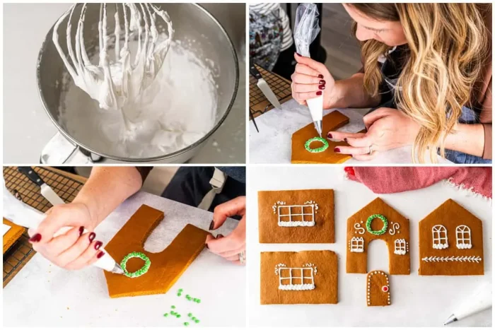 Décorer les parois : l’astuce essentielle consiste à décorer les parois avant de monter la maison. Préparez le glaçage royal, puis couvrez le bol d’un linge humide pour qu’il ne sèche pas.