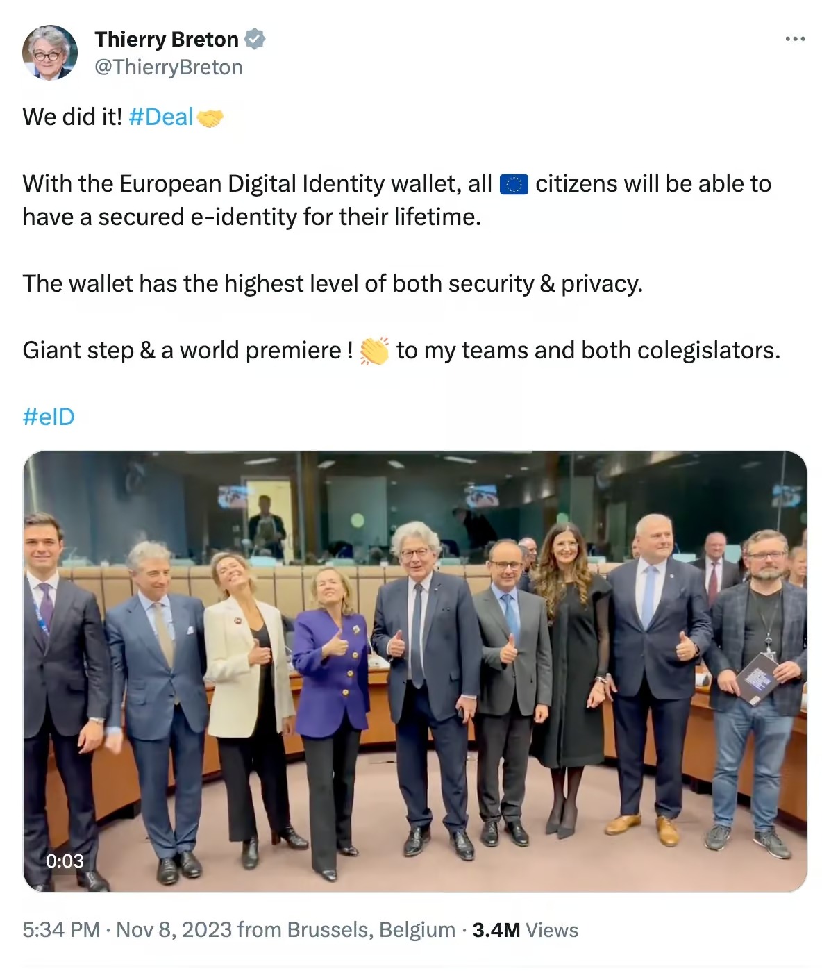 Mercredi dernier, le 8 novembre, Thierry Breton, le commissaire européen chargé du marché intérieur, a fièrement annoncé sur Twitter/X qu’un accord avec les députés européens avait été conclu pour créer un « portefeuille d’identité numérique » européen, qui permettra à tous les citoyens de l’UE de disposer d’une « identité électronique sécurisée pour leur vie entière ».