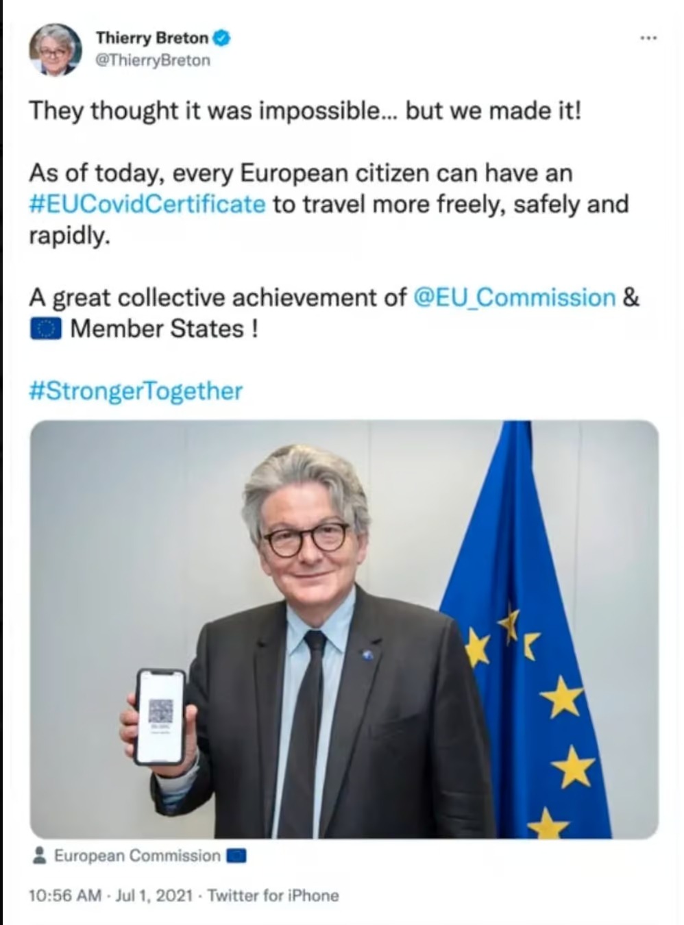 Des personnalités politiques comme Thierry Breton et Ursula von der Leyen, tout comme les députés européens et les gouvernements des États membres qui ont encouragés les mesures anti-Covid, sont prêts à traiter les citoyens comme du bétail, comme de simples vecteurs de maladies à vacciner et à tester en masse, et font peu de cas de leurs antécédents médicaux et du facteur risque. Ce n’est probablement qu’une question de temps avant que ces personnes, qui affichent un tel mépris pour la liberté individuelle des gens, ne décident de tirer parti d’une technologie comme l’identification numérique universelle, espérant contrôler les choix privés des gens et faire avancer leur propre carrière ou objectifs politiques.