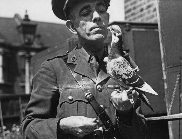 Le Capitaine Caiger du Service de Pigeon de l’Armée Britannique, tenant un pigeon voyageur équipé d’une capsule de message «porteur arrière», le 23 juillet 1945. (l’agence de presse de Topical / Hulton Archive / Getty Images)