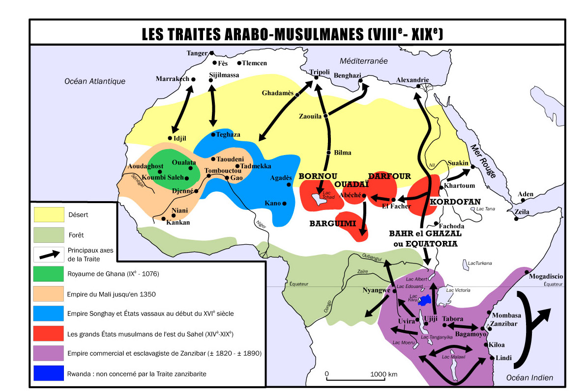 Toutefois, l’amplitude spatio-temporelle et le nombre de victimes générées par la traite trans-saharienne et orientale semble sans commune mesure. De plus, l’asservissement des populations noires sera légitimé par l’émergence des premières théories raciales de la part d’érudits musulmans respectés dont la pensée faisait largement autorité comme Ibn Khaldoun (1332-1406).