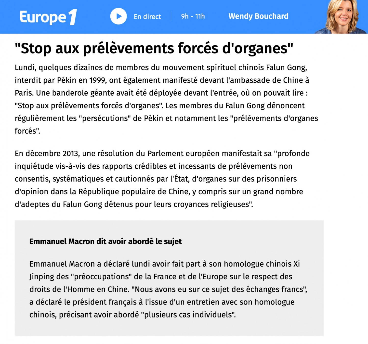 En ajoutant: « Les manifestations du Falun Gong à proximité de l’ambassade se sont toujours bien passées années après années, cela envoie aussi un signal positif, c’est le message aussi que l’association veut faire passer ».