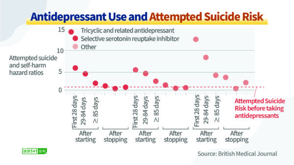 Une recherche publiée dans le British Medical Journal confirme que le risque de tentatives de suicide est nettement plus élevé dans les 28 jours suivant la prise d’antidépresseurs. De plus, les symptômes peuvent rebondir gravement à court terme après l’arrêt du médicament, de sorte que les tendances suicidaires sont également élevées pendant la phase de sevrage.