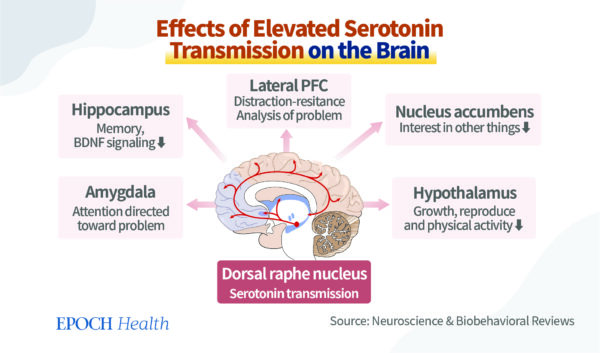 Par exemple, si le niveau de sérotonine dans l’hippocampe est défectueux, cela entraînera des pertes de mémoire et réduira la signalisation du facteur neurotrophique dérivé du cerveau ; si le niveau de sérotonine dans l’hypothalamus est défectueux, cela affectera la capacité du corps à croître, à se reproduire et à faire des activités physiques.