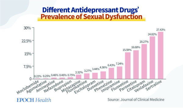 Un article de synthèse publié dans le Journal of Clinical Medicine a révélé que de nombreux antidépresseurs peuvent provoquer des dysfonctionnements sexuels, la prévalence de certains pouvant atteindre 20 à 30%.