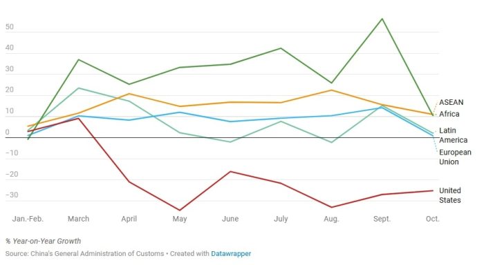 Les exportations à destination de l’ASEAN (principal partenaire commercial de la Chine) affichent une progression de 11 % sur un an en octobre, contre +15,6 % en septembre.