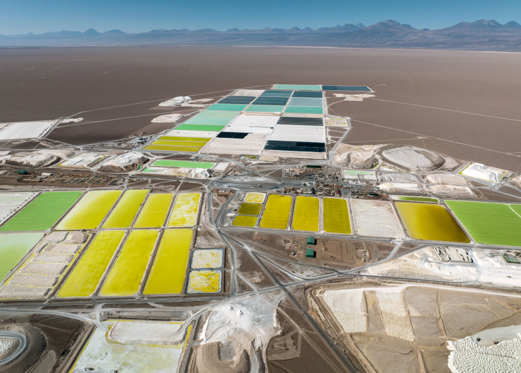 Des bassins de saumure contenant du carbonate de lithium et des monticules de sel dans le salar d’Acatama au Chili, le 24 août 2022. Au cours d’un processus de 18 mois, le liquide passe par 15 bassins et finit par virer du bleu foncé au jaune vif avec une concentration en lithium de 6%. Il est ensuite transporté par camion jusqu’à une usine chimique d’Albemarle à Antofagasta, où il est transformé en poudre de carbonate de lithium de qualité batterie expédié à l’étranger. (Photo par John Moore/Getty Images)