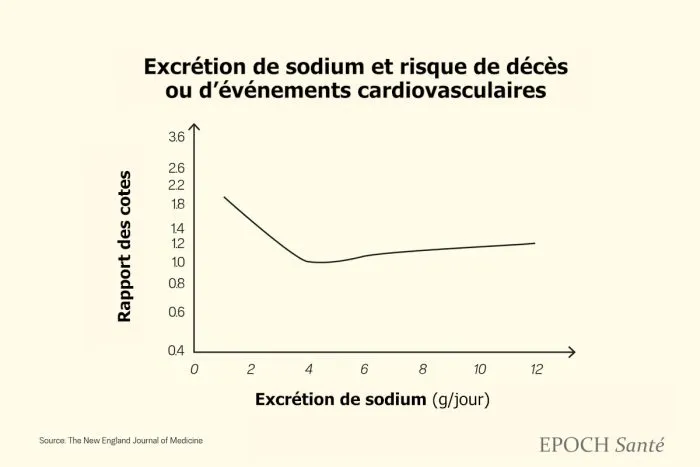 Les chercheurs ont identifié une courbe d’association en forme de « J » entre l’excrétion de sodium et le risque de décès ou d’événements cardiovasculaires. (Epoch Times)