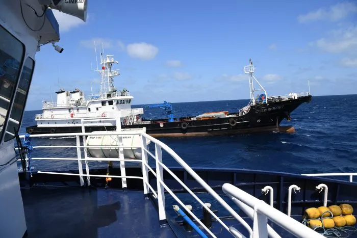 Un navire chinois manœuvrant près du navire BRP Datu Tamblot du Bureau philippin des pêches et des ressources aquatiques (BFAR) près du récif de Scarborough, contrôlé par la Chine, dans les eaux contestées de la mer de Chine méridionale, le 16 février 2024. (TED ALJIBE/AFP via Getty Images)