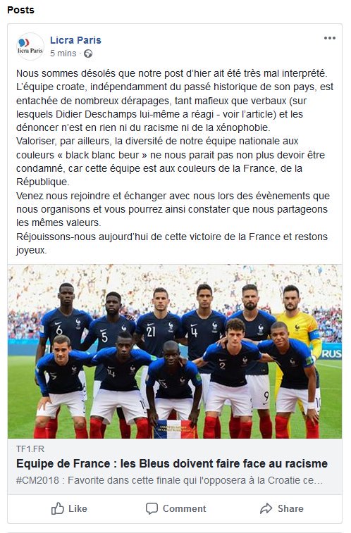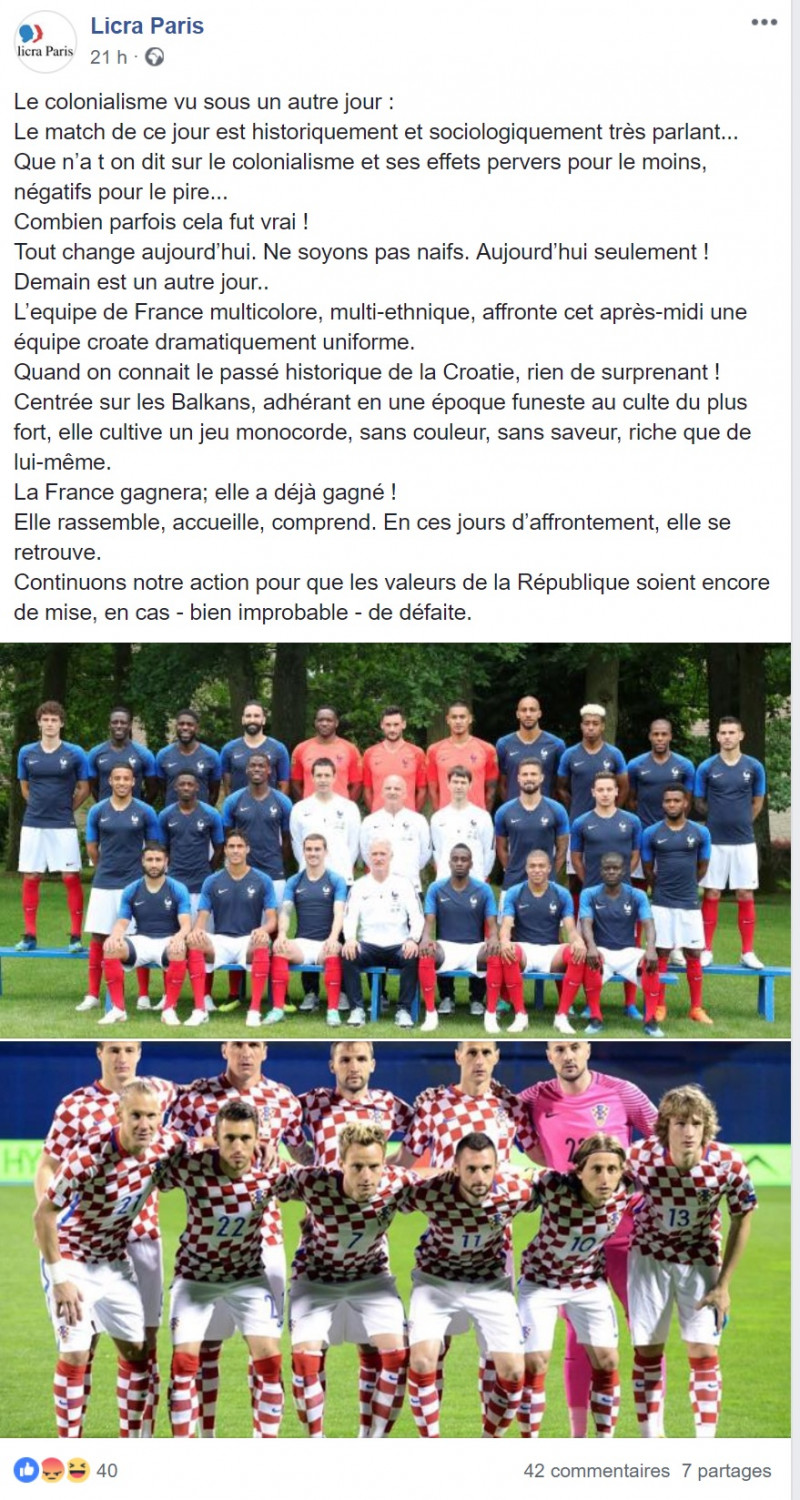 « L’équipe de France multicolore, multi-ethnique, affronte cet après-midi une équipe croate dramatiquement uniforme », a écrit la Licra.