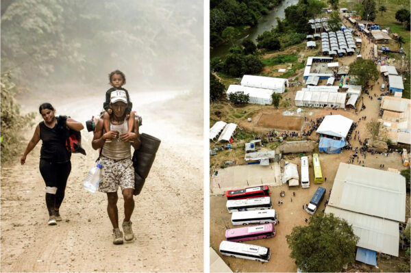 (En haut à gauche) Vue aérienne du camp de migrants de Lajas Blancas dans le bouchon du Darien. Des bus transportent les migrants jusqu’à la frontière avec le Costa Rica. (En haut à droite) Une famille vénézuélienne se marche de Bajo Chiquito à Lajas Blancas, au Panama, le 18 février 2024. (En bas) Des hommes se baignent dans la rivière Chucunaque après avoir traversé le bouchon du Darien depuis la Colombie, à Lajas Blancas, au Panama, le 17 février 2024. (Bobby Sanchez pour Epoch Times)