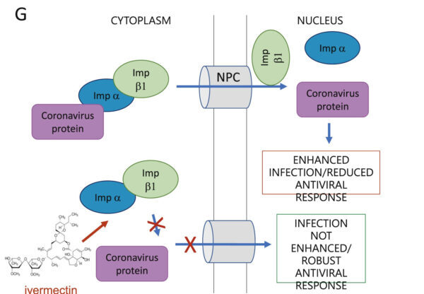 Une stratégie contre le SRAS‑CoV‑2, ainsi que d’autres virus à ARN endémiques et pandémiques, est d’interférer dans le transport des virus dans le noyau d’une cellule hôte. Il a été démontré que l’ivermectine y parvient en liant, déstabilisant et inhibant la protéine IMP alpha/beta1. Lorsque cette protéine est inhibée, les virus sont incapables de pénétrer dans le noyau d’une cellule, et donc de se répliquer. Il en résulte une diminution de l’infection. L’IMP alpha/beta 1 a été inhibée dans l’entrée du SRAS‑CoV‑2 dans les noyaux par l’ivermectine. Auparavant, on avait observé que l’ivermectine inhibait cette même protéine dans l’entrée d’autres virus à ARN, ce qui lui confère un effet antiviral à large spectre. [325] [326] [327]