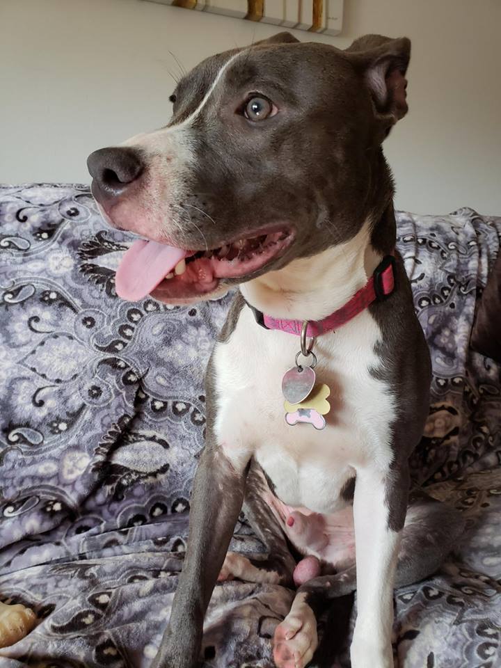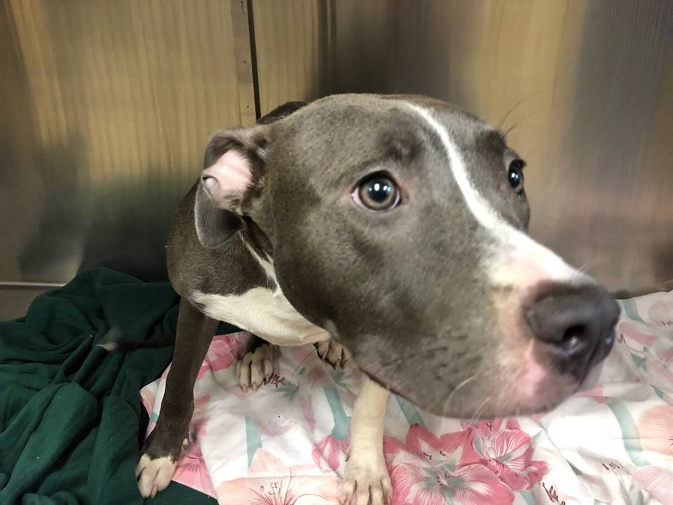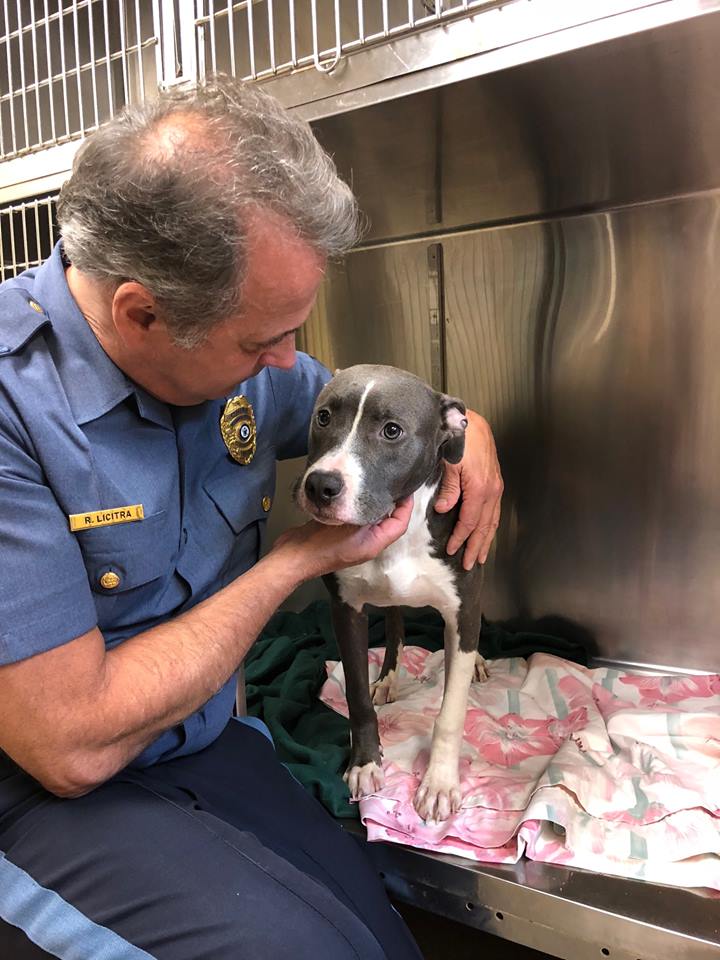 Le chien est un pit-bull mâle gris et blanc âgé d’un an et se serait probablement noyé si le promeneur et son chien ne l’avaient pas remarqué piégé dans les eaux montantes.