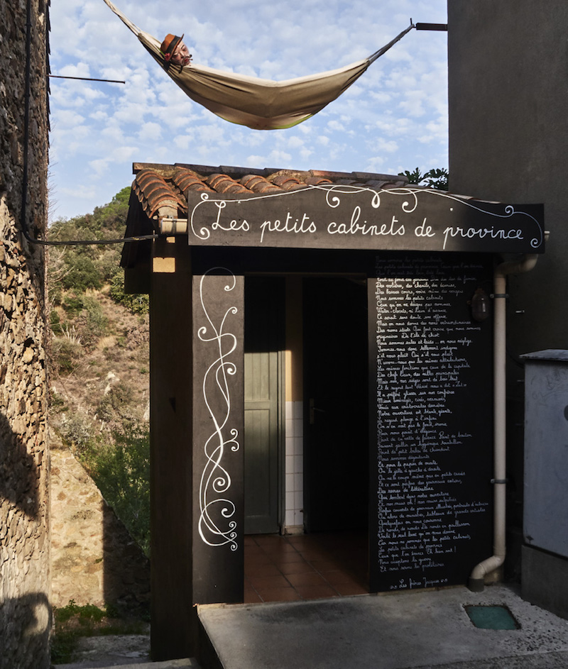 Pour une fois, plaisir de passer par les toilettes publiques du village sous la houlette des Frères Jacques et de leurs petits cabinets de province ! (Charles Mahaux)