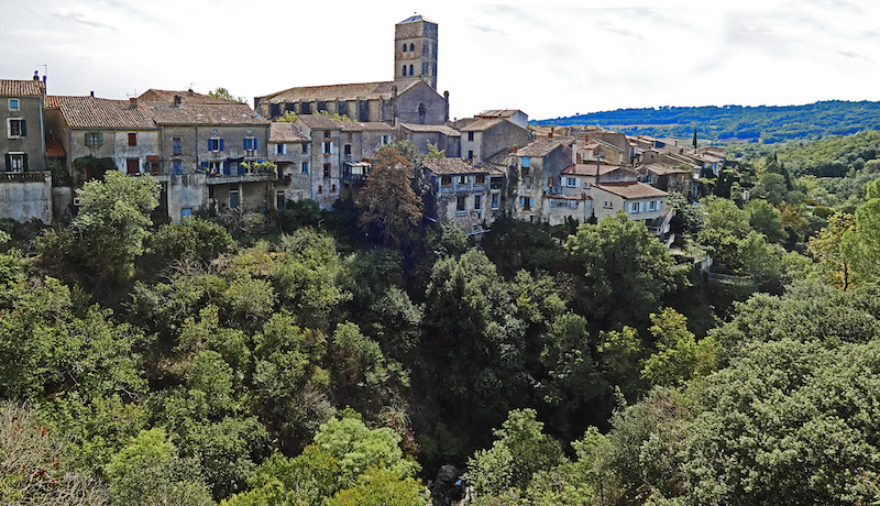 Montolieu resserré autour de son église se découvre sur un promontoire surplombant deux gorges profondes avec à l’arrière-plan les forêts profondes de la Montagne Noire. (Charles Mahaux)