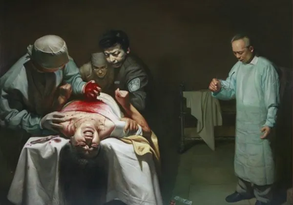 « Crimes d’organes ». Peinture à l’huile représentant le prélèvement d’organes en Chine sur une pratiquante de Falun Gong toujours en vie. Xiqiang Dong est l’artiste. (Avec l’aimable autorisation de Xiqiang Dong.)