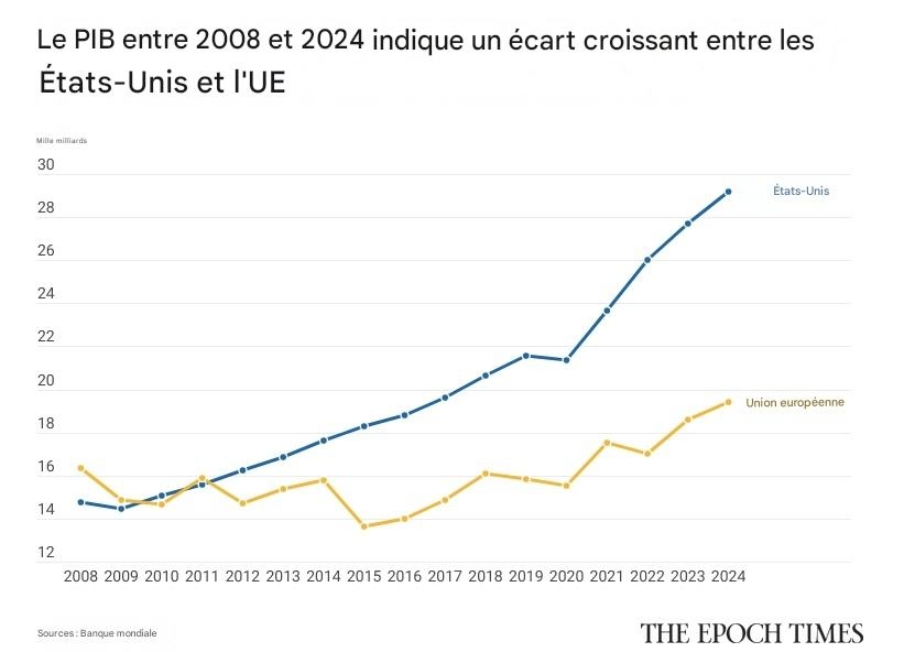 Menée par l’Allemagne, la France et le Royaume-Uni, la zone euro affichait en 2008 un PIB supérieur à celui des États-Unis, mais il est aujourd’hui inférieur de 30 % (avec le Royaume-Uni) et de 50 % sans celui-ci, souligne M. Puzder.