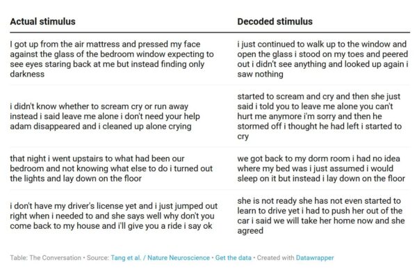 Le décodeur a utilisé les réponses cérébrales de trois participants enregistrées alors que ceux-ci écoutaient des histoires, et il a généré des séquences de mots qui auraient pu produire l’activité cérébrale enregistrée. Ces séquences de mots reproduisaient plutôt bien l’idée générale de l’histoire, et, dans certains cas, incluaient même des mots ou des phrases exacts.
