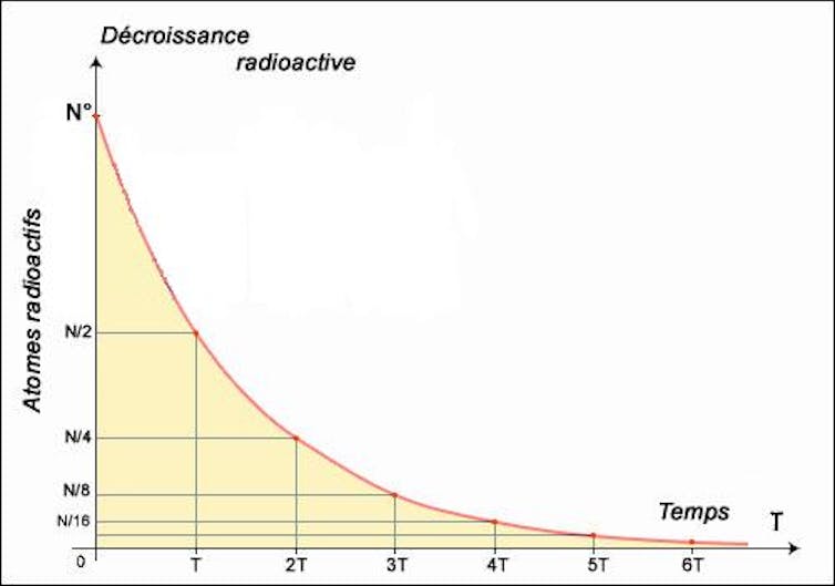 C’est la règle du bon sens, et l’on trouve que l’échantillon décroît exponentiellement en fonction du temps, ce qui s’écrit : N=Noexp(-t/T).