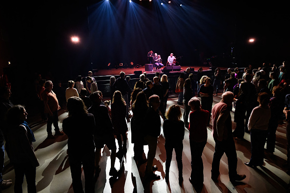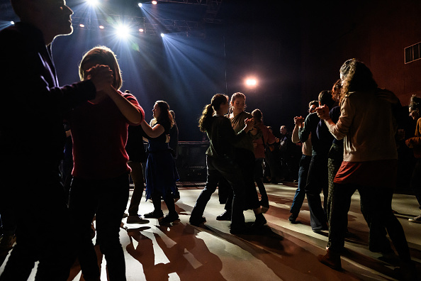 Des personnes participent à une initiation aux danses traditionnelles d’Auvergne lors du « bal barré » à la Coopérative de Mai, à Clermont-Ferrand, le 14 mars 2025. (JEAN-PHILIPPE KSIAZEK/AFP via Getty Images)