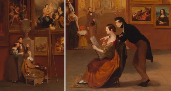 Détails de (G) James Fenimore Cooper et sa famille et de (D) M. Morse instruisant une élève, extraits de « Gallery of the Louvre », 1831–1833, par Samuel F. B. Morse. (Domaine public)