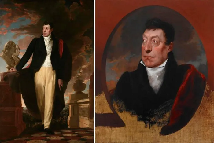 (G) Portrait en pied du marquis de Lafayette, 1826, par Samuel F. B. Morse. Huile sur toile. City Hall Portrait Collection, New York. (D) Portrait du marquis de Lafayette, 1825, par Samuel F. B. Morse. Huile sur toile ; 75,5 cm × 62,7 cm. Crystal Bridges Museum of American Art, Arkansas. (Domaine public)