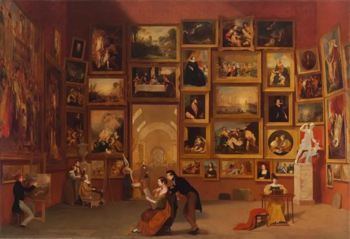 « Gallery of the Louvre », 1831–1833, par Samuel F. B. Morse. Huile sur toile ; 187,3 cm × 274,3 cm. Terra Foundation for American Art, Chicago. (Domaine public)