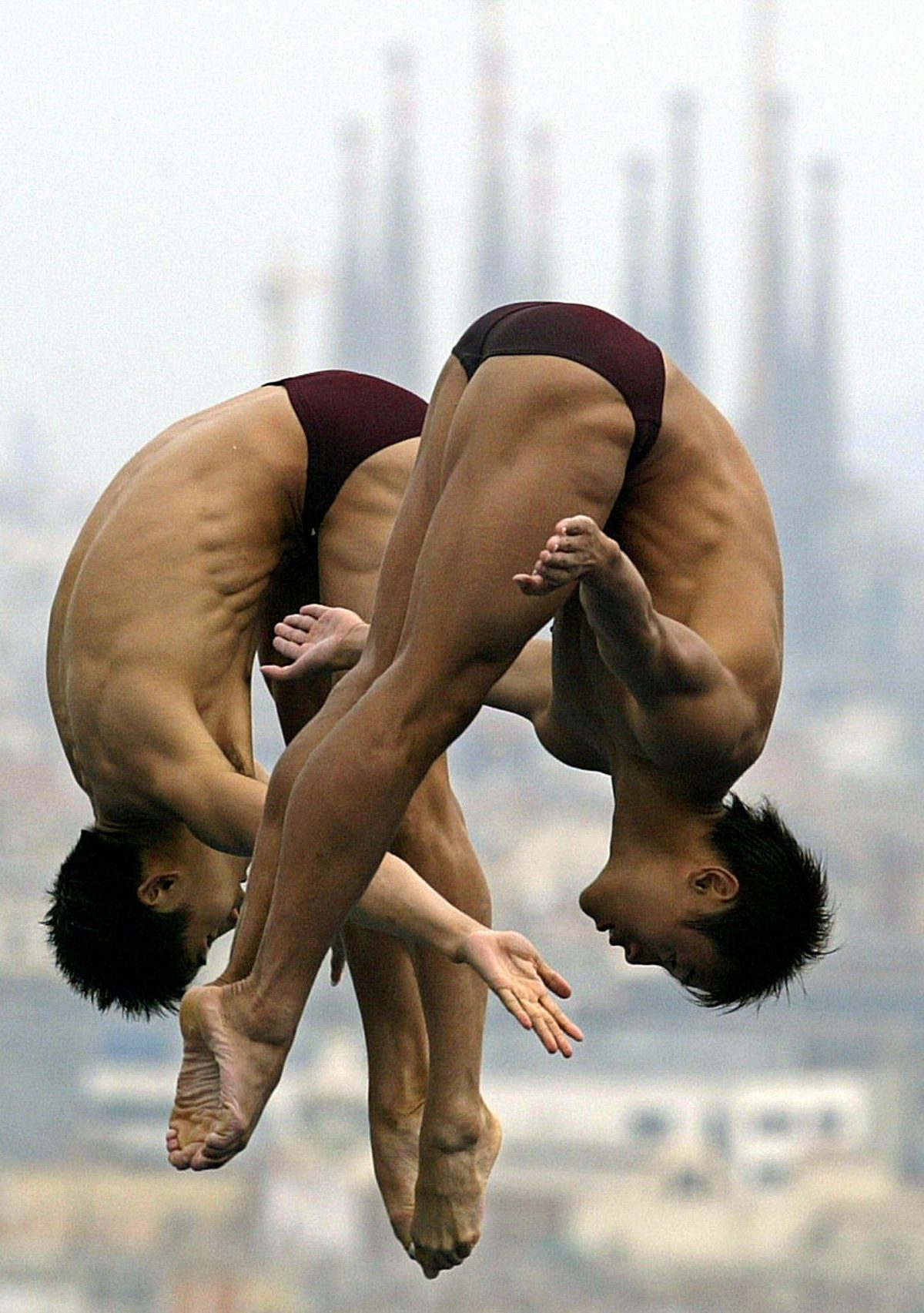 Les plongeurs chinois Tian Liang et Jia Hu lors des préliminaires du plongeon masculin synchronisé au 10e championnat du monde de natation à Barcelone, en 2003. (LLUIS GENE / AFP / Getty Images)