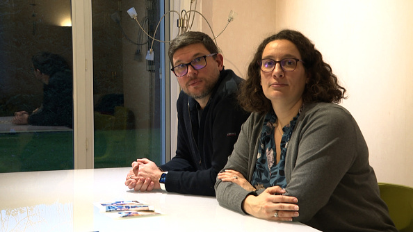 Les parents d’Evaëlle, Marie (à dr.) et Sébastien dans leur maison à Herblay, le 12 décembre 2019. (Photo AURELIA MOUSSLY/AFPTV/AFP via Getty Images)