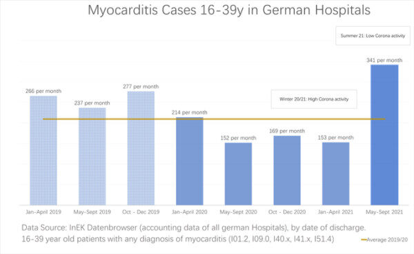 Cela est impossible à prouver avec une certitude absolue, mais ces données indiquent clairement que la vaccination de masse dans ces pays européens a entraîné une augmentation des taux de myocardite (les cas sont plus fréquents chez les jeunes hommes de moins de 40 ans).