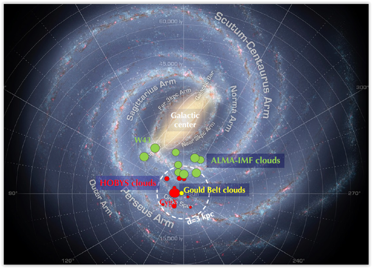 Comme je l’ai décrit plus haut, les étoiles se forment dans des cœurs denses au sein de nuages moléculaires. Une étoile mettant plusieurs millions d’années à se former il est impossible d’observer « en direct » la formation des étoiles dans un nuage moléculaire. En revanche, puisque les étoiles se forment dans les cœurs denses on peut observer ces derniers pour « prédire » les étoiles que le nuage moléculaire va générer. C’est ce qu’on fait les astrophysiciens dans les années 2000 en observant les plus proches nuages moléculaires formant des étoiles : les nuages de la ceinture de Gould (en jaune sur la vue artistique de la Voie Lactée, ci-dessous).