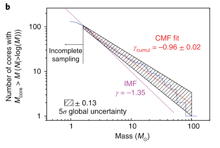 Le graphique ci-dessous résume la distribution de la population de cœurs dans W43. L’histogramme en bleu indique le comptage des cœurs (nombre de cœurs ayant une masse donnée). La courbe rouge est l’ajustement à l’histogramme, c’est-à-dire la fonction mathématique qui représente le mieux les pics de l’histogramme. Enfin, la zone hachurée montre le domaine d’incertitude de l’ajustement. Il s’agit de la première observation montrant une différence nette entre la courbe en rouge et la pente théorique de la fonction initiale de masse des étoiles indiquée en magenta. Autrement dit, une entorse flagrante à l’universalité de la fonction initiale de masse.