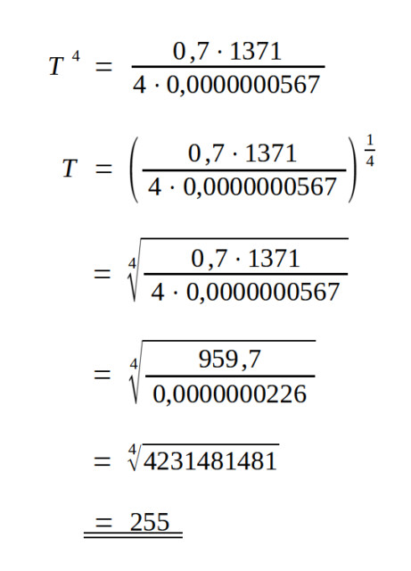 Mais revenons au calcul de l’école secondaire. L’équation se compose de quatre nombres : 1371, 4, 0,7 et 0,0000000567. Les trois premiers sont triviaux et même compréhensibles en maternelle. 1371 en watts par mètre carré est la puissance du soleil qui atteint la Terre depuis l’espace. Le chiffre 4 représente le rapport géométrique entre la surface sphérique et le disque circulaire de la Terre.