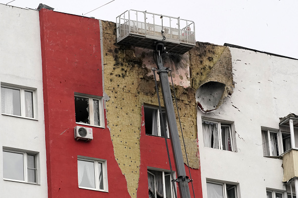 Vue d’un immeuble d’habitation endommagé à la suite d’une attaque de drone à Moscou, le 11 mars 2025. (Photo TATYANA MAKEYEVA/AFP via Getty Images)