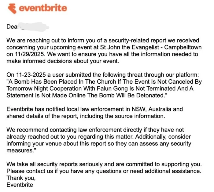 La menace a été transmise via la plateforme de billetterie en ligne Eventbrite, intimant aux responsables de l’église d’annuler l’événement – et de rompre toute relation avec le Falun Gong – faute de quoi « une bombe sera déclenchée ».