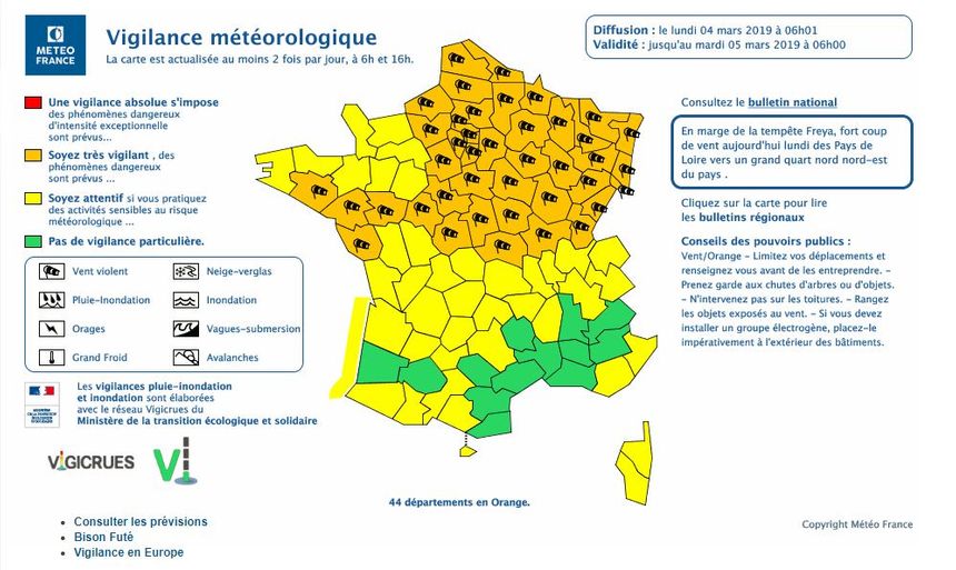 Tous les départements des Hauts-de-France, de la Haute-Normandie, de l’Ile-de-France, du Grand-est et de la Bourgogne Franche-Comté sont donc en vigilance orange, plus le Loiret, l’Eure-et-Loir, le Cher, l’Indre, l’Indre-et-Loire, le Loir-et-Cher, la Loire-Atlantique, le Maine-et-Loire, le Morbihan, la Vendée, et l’Allier.