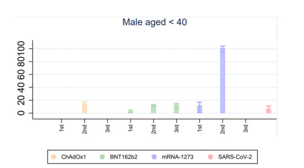 Une nouvelle analyse du risque relatif de myocardite par des chercheurs d’Oxford a été publiée dans Nature Medicine le 14 décembre. Les auteurs ont constaté des taux plus élevés de myocardite induite par le vaccin que de myocardite due à l’infection chez les hommes âgés de 16 à 39 ans pour plusieurs doses de vaccin : Pfizer, doses 2 et 3, et Moderna, doses 1 et 2. Ce graphique compare les taux :