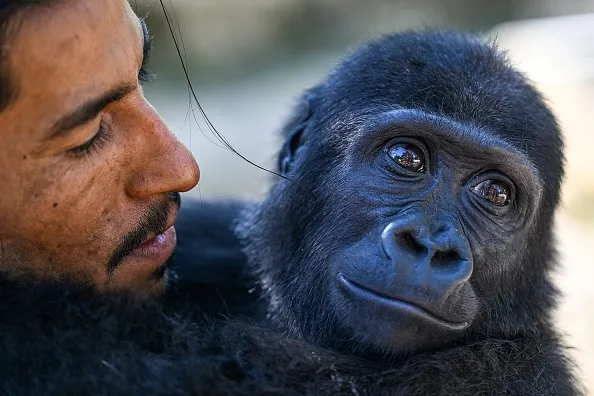 Un bébé gorille nommé Zeytin s’accroche au cou du soigneur au zoo de Polonezköy à Istanbul, le 3 septembre 2025. (OZAN KOSE/AFP via Getty Images)